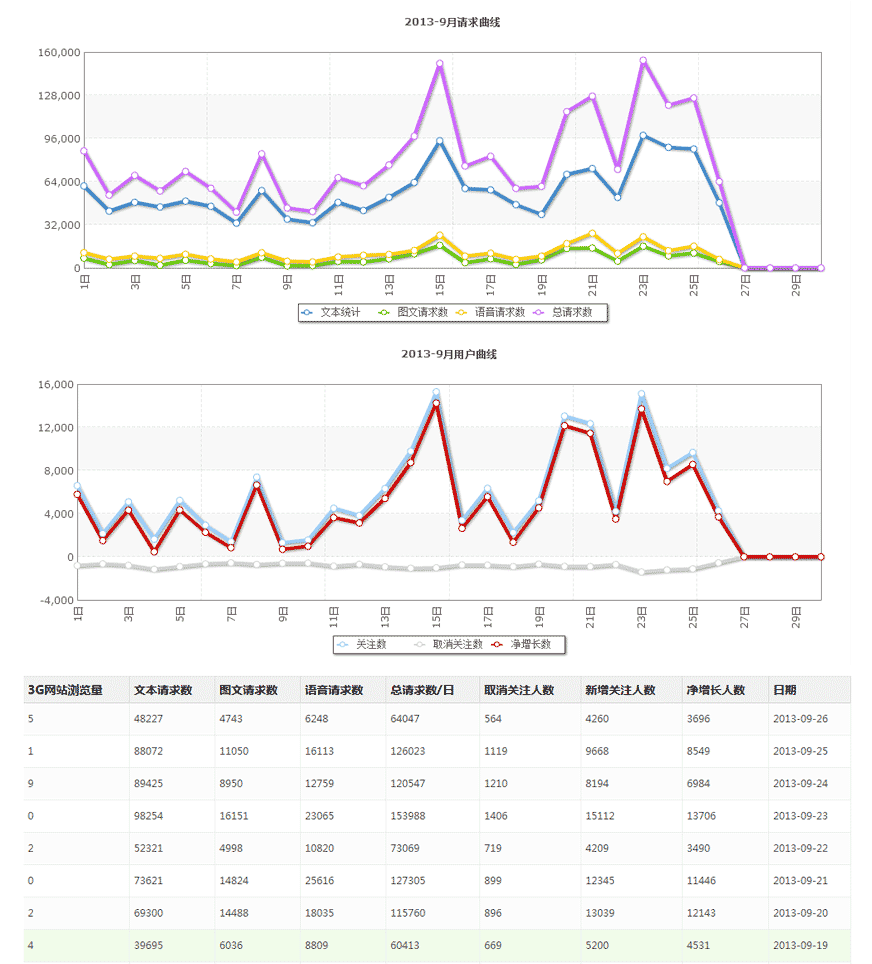 后台可以实时统计微信公众号的粉丝关注情况和用户语音请求数,