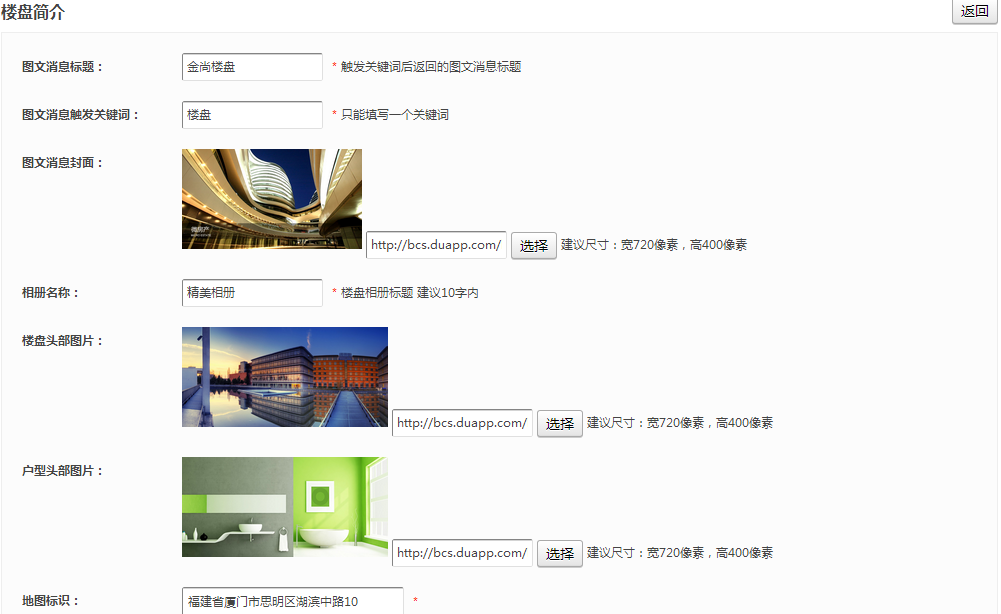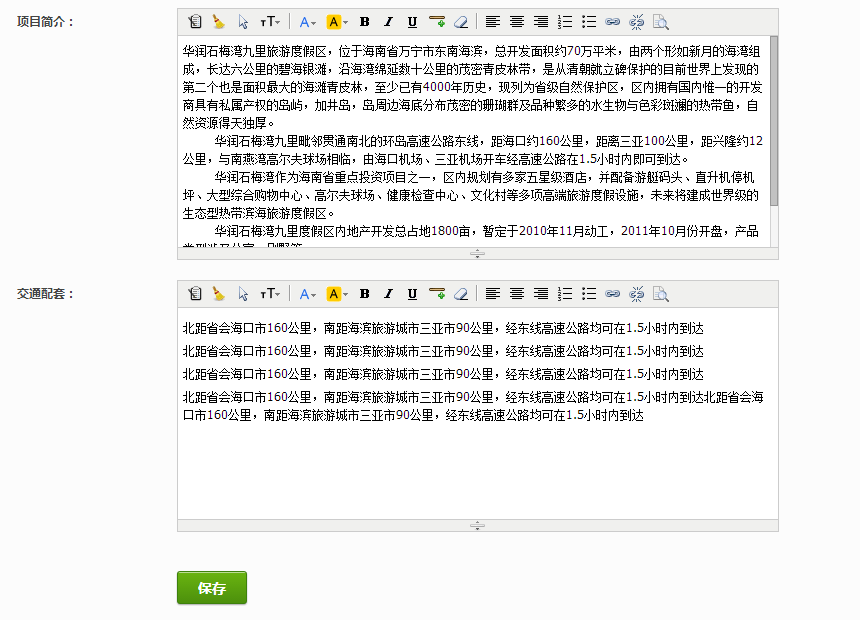 点击”新增楼盘”进入楼盘简介编辑页面,填写楼盘简介内容,保存。