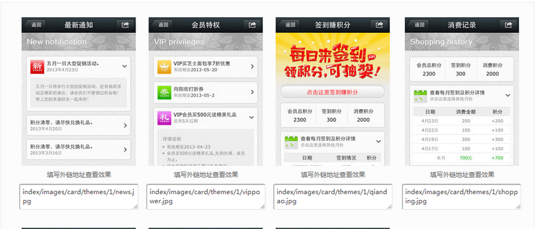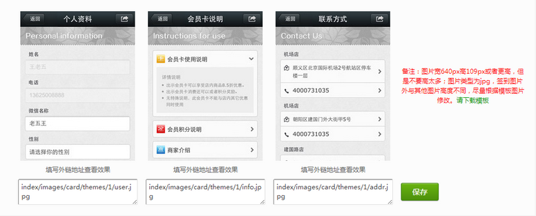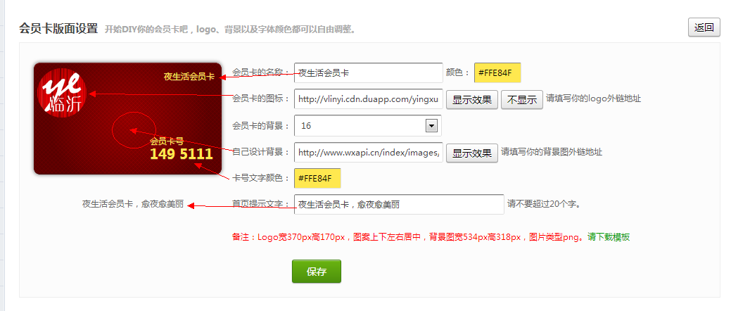 2、会员卡可以使用自己的图片:Logo宽370px高170px,图案上下左右居中,背景图宽534px高318px,图片类型png。