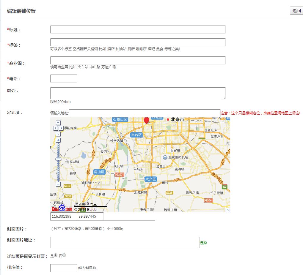 经纬度:直接输入中文地址,然后拖动红色标注,在你需要的地址位置
