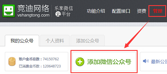 登录乐享后,点击管理进入“管理”,再点击添加公众号: