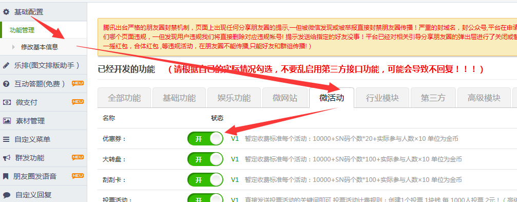 第一步:在微活动下找到优惠券的按钮,开启优惠券功能