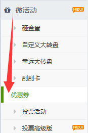 操作步骤:F5或者鼠标右键刷新网页-->在左侧菜单栏找到微活动-->微活动下找到优惠券功能-->点击进入新增界面