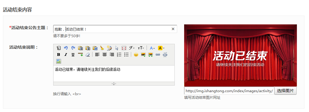 2、填写活动结束的内容;