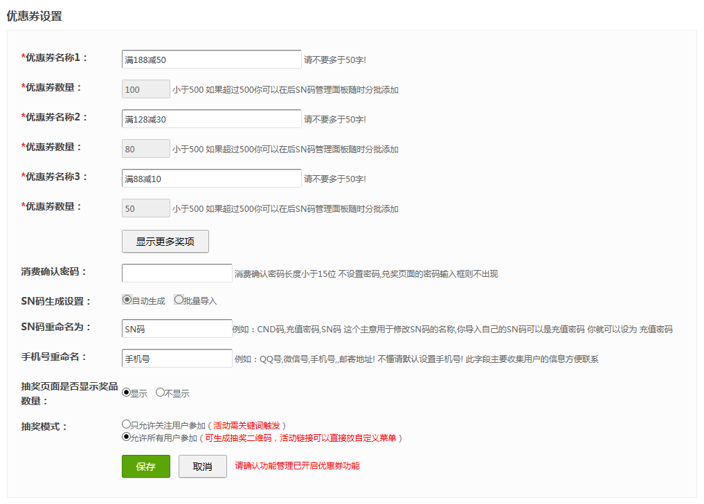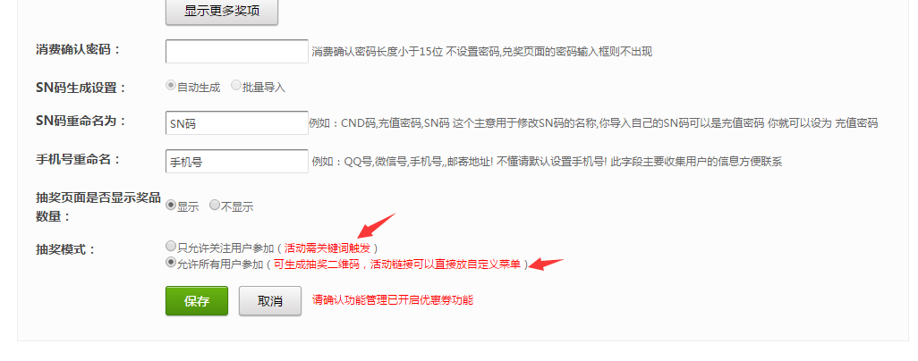 ① 只允许关注用户参加,就是强制用户必须关注公众号才可以领取优惠券。这种方式只能通过设置关键词触发,无法生成抽奖二维码和活动链接去更多渠道宣传。