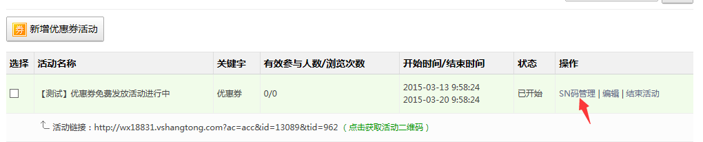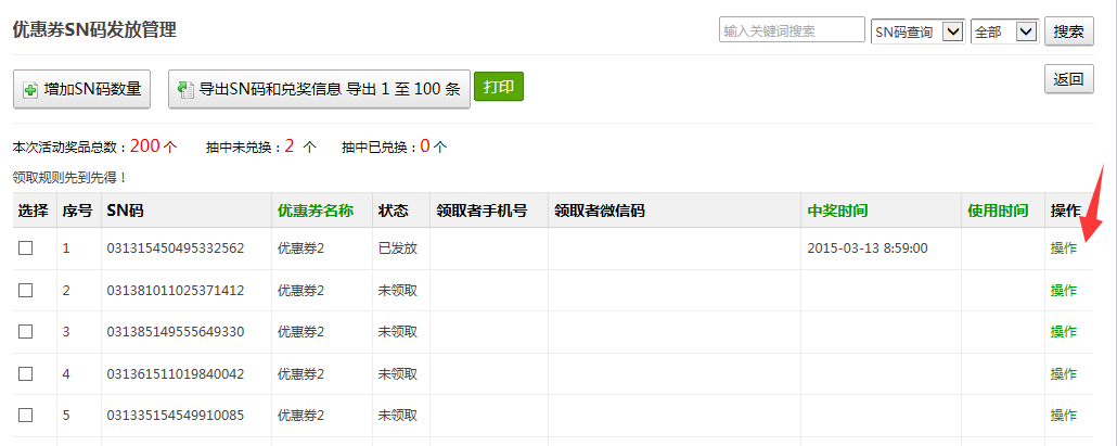 3、兑奖,查看活动粉丝中奖详情;(点击SN码管理查看详情)