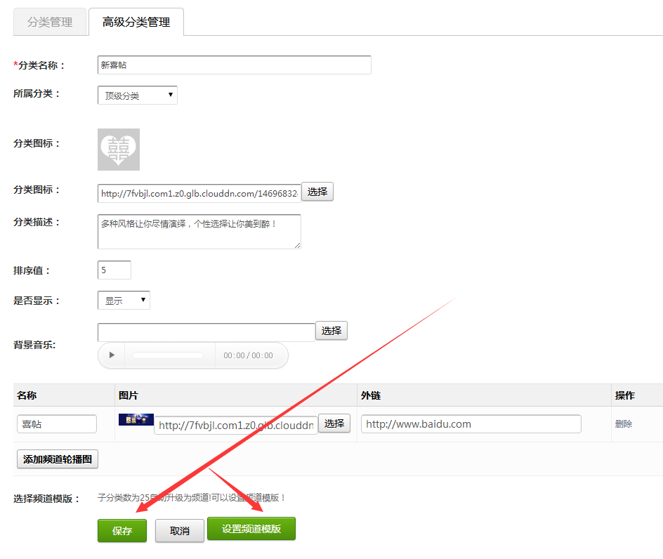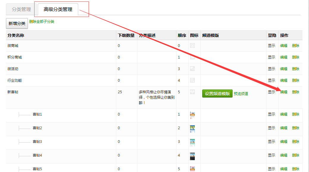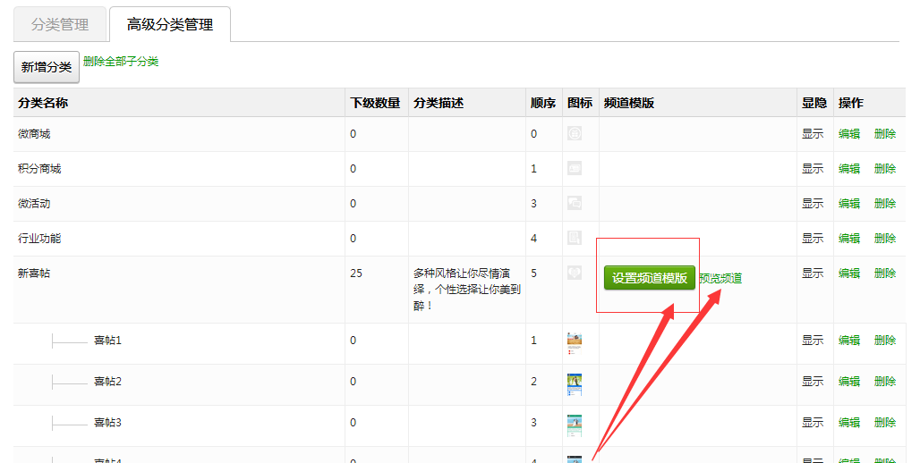 例如:微喜帖,点击微喜帖编辑,设置封面图,保存后出现设置频道模板按钮