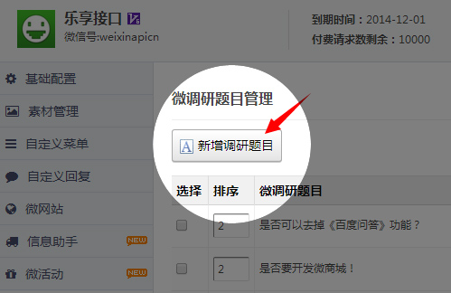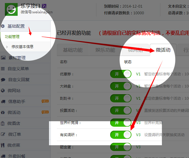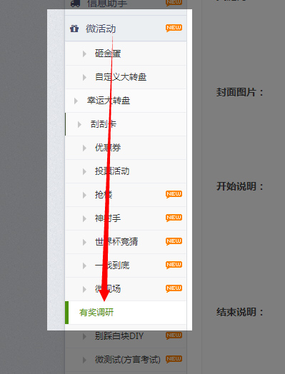 1.点击左侧功能管理——微活动模块——勾选中有奖调研。