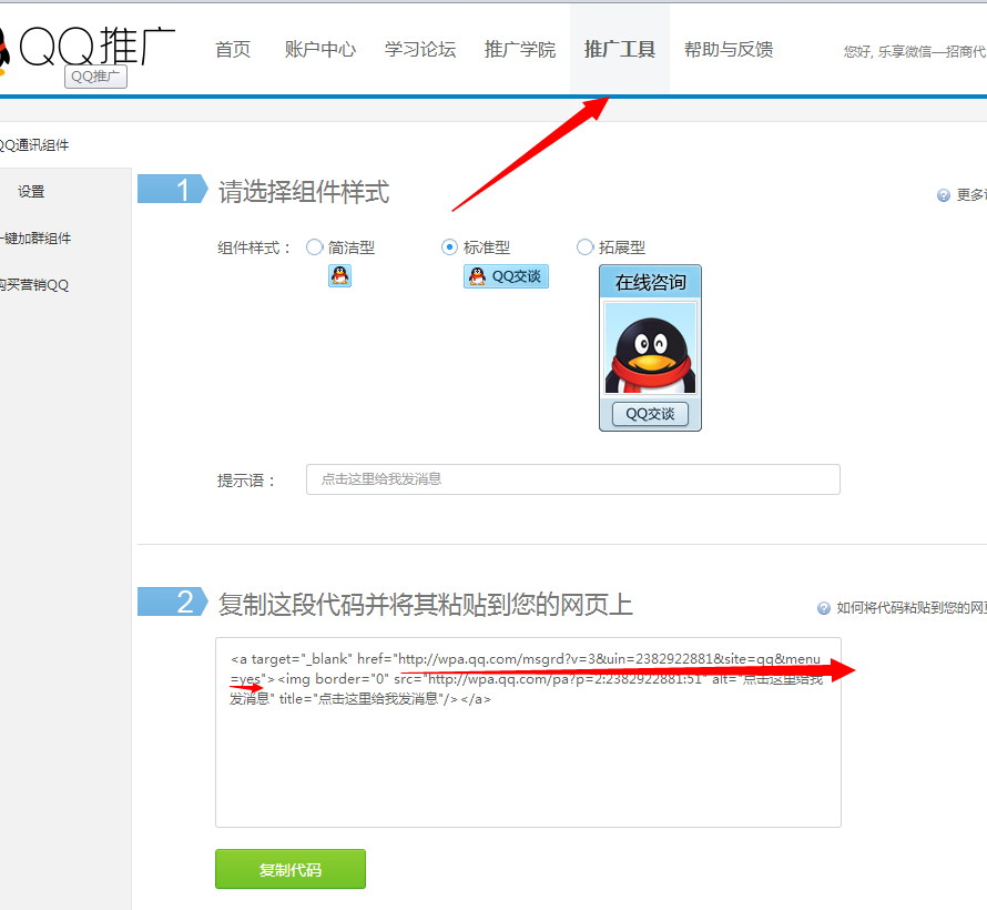 三、点击推广工具——QQ通讯组件,复制链接“http://wpa.qq.com/msgrd?v=3&uin=2382922881&site=qq&menu=yes”