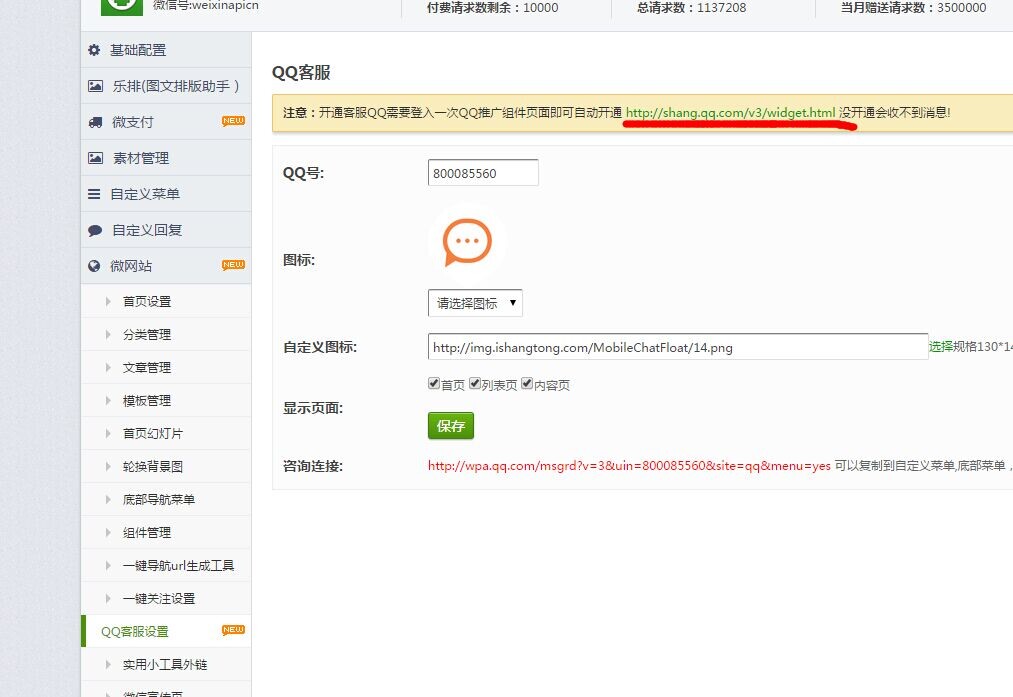 填写客服QQ号,选择图标,跟显示的地址,保存
