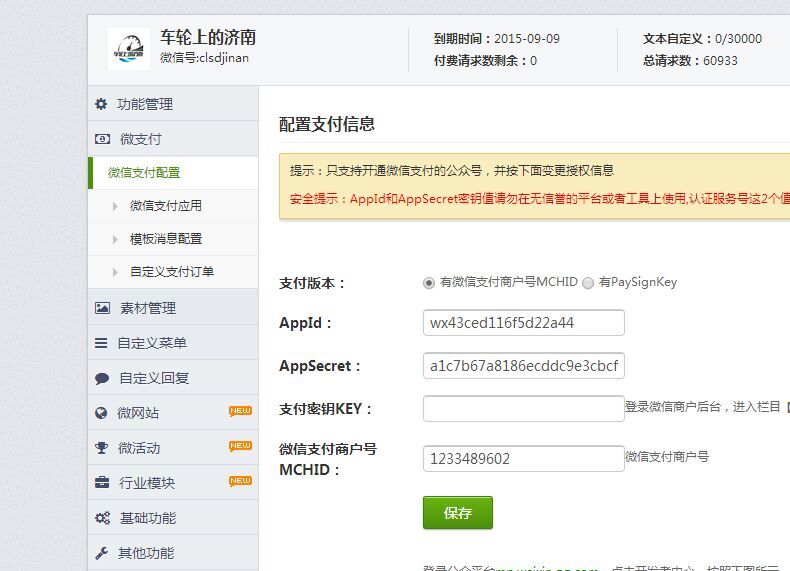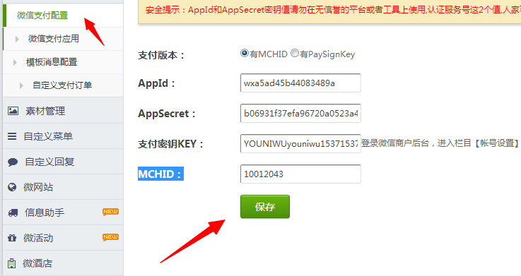 微支付栏目——填写appid、appsecret、微信支付商户号、支付秘钥——保存