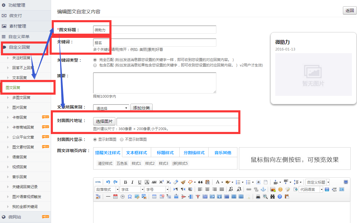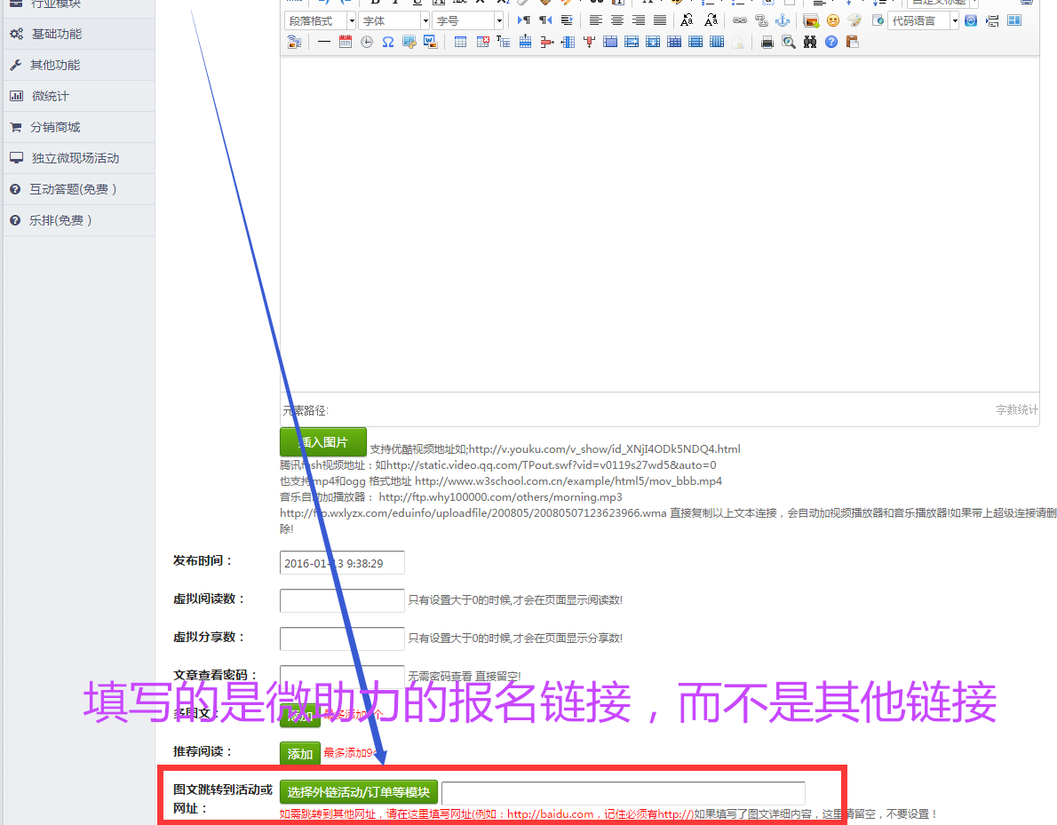 1、新建一个乐享图文,填写标题、关键词、图文跳转外链粘贴微助力报名链接