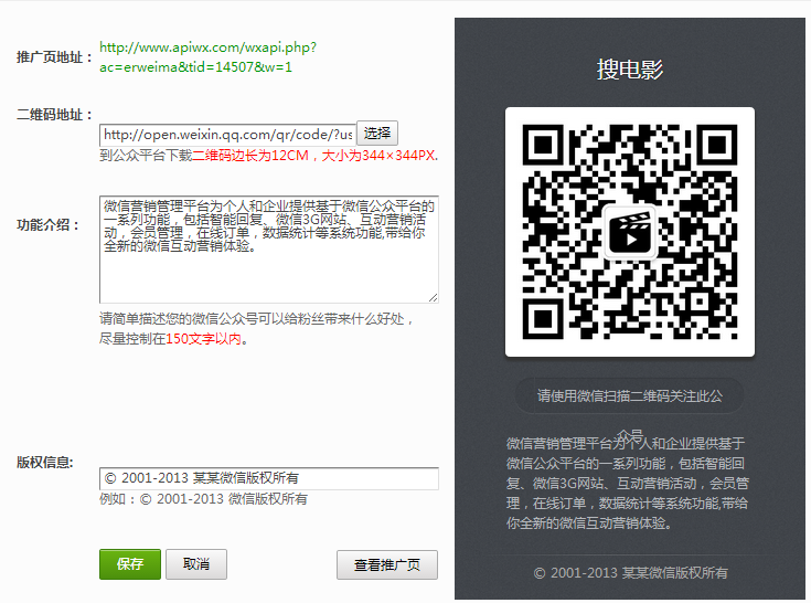微信公众号二维码推广页设置:用于推广微信公众号,可以发布到qq群、微博、论坛中,用于吸引粉丝。