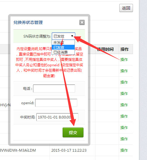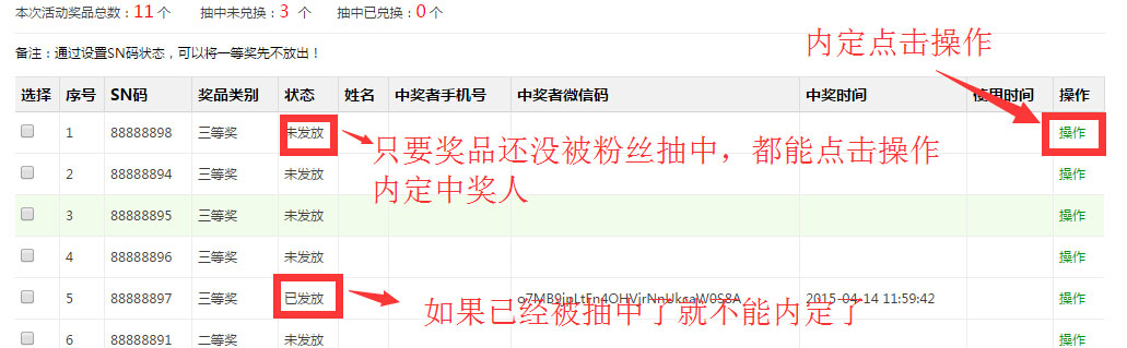 2、内定中奖:点击操作,将指定奖品设置为已发放,填上具体中奖人的openid