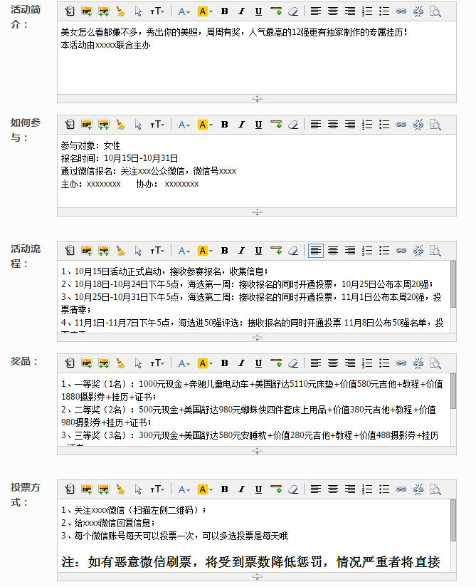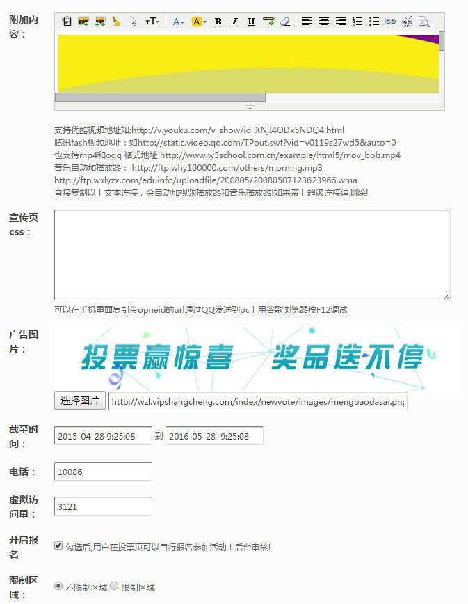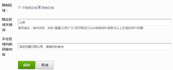 想到区域关键词可填写省份名称和部分城市名称,填写了之后参与的人就只限制本区域的用户(此功能可以防止活动范围外的人参与和刷票)