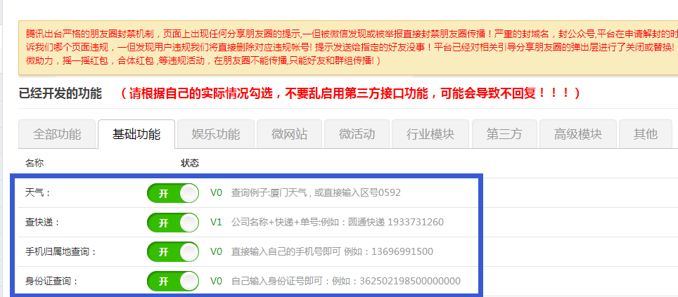 注意:功能开关后面都有提示发送什么关键词,触发功能
