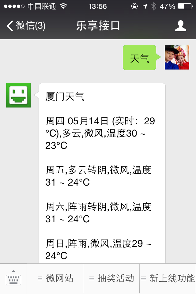 对着公众号发送“关键词”例如:天气
