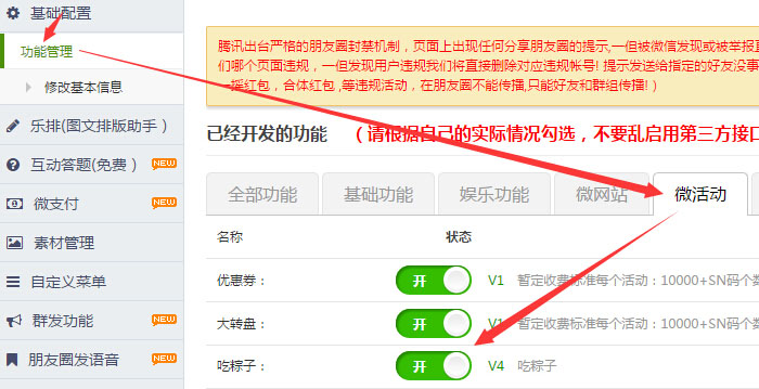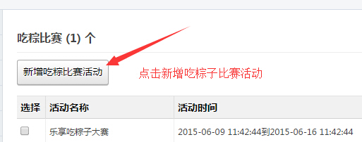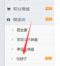 操作步骤:F5或者鼠标右键刷新网页-->在左侧菜单栏找到微活动-->微活动下找到吃粽子比赛活动功能-->点击进入新增界面