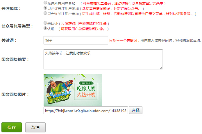 关注模式:允许所有用户参加 (可生成抽奖二维码,活动链接可以直接放自定义菜单)