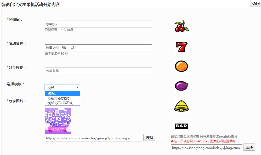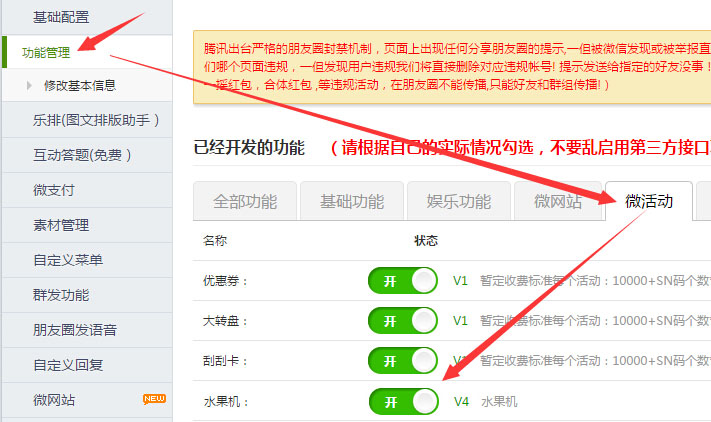 操作步骤:基础配置-->功能管理-->微活动-->水果机功能开关按钮-->开启