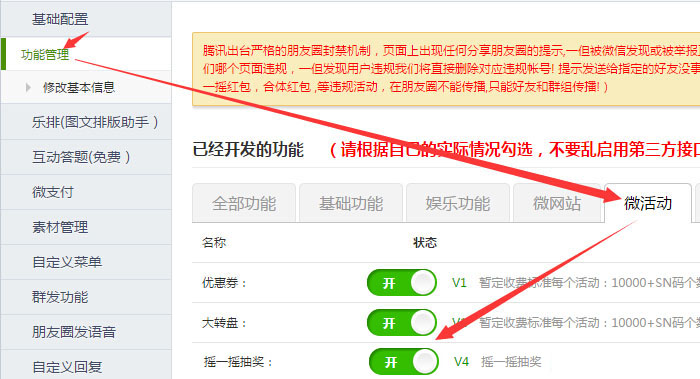 操作步骤:基础配置-->功能管理-->微活动-->摇一摇抽奖功能开关按钮-->开启