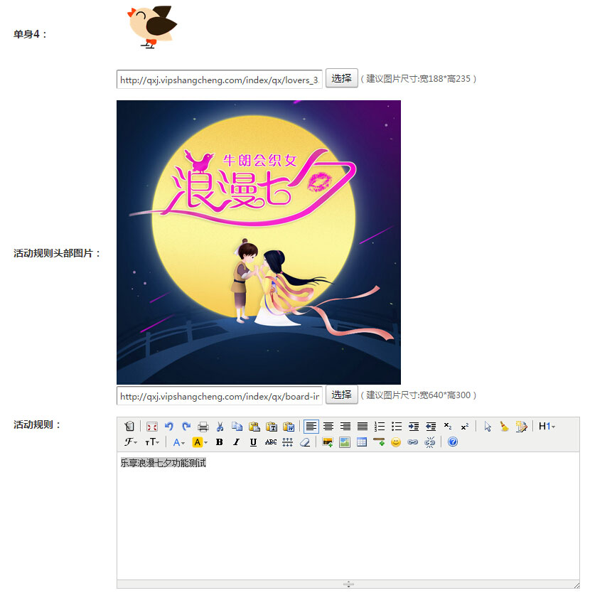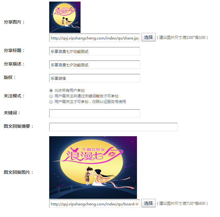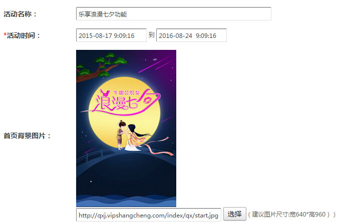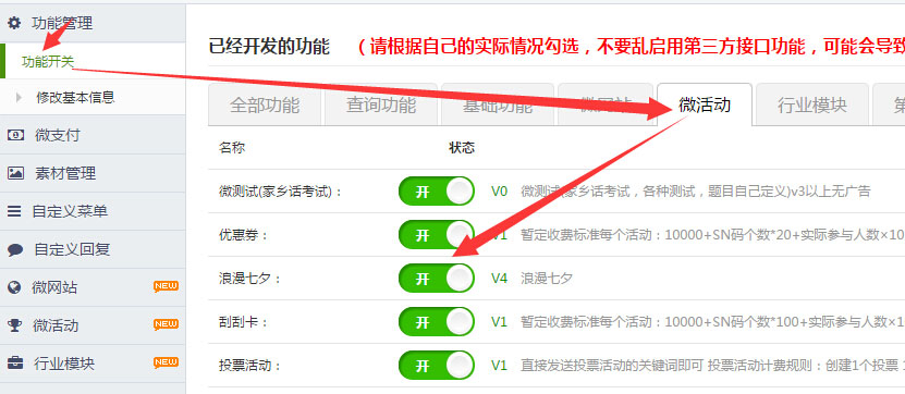 操作步骤:基础配置-->功能管理-->微活动-->浪漫七夕功能开关按钮-->开启