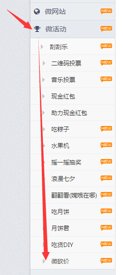 操作步骤:F5或者鼠标右键刷新网页-->在左侧菜单栏找到微活动-->微活动下找到微砍价活动功能-->点击进入新增界面