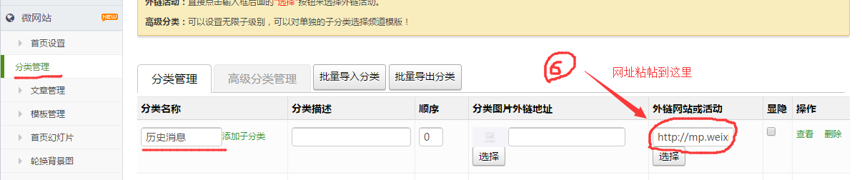 6.历史消息的网址可以放到微网站的分类里面