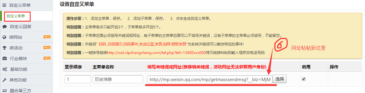历史消息的网址可以放到自定义菜单里