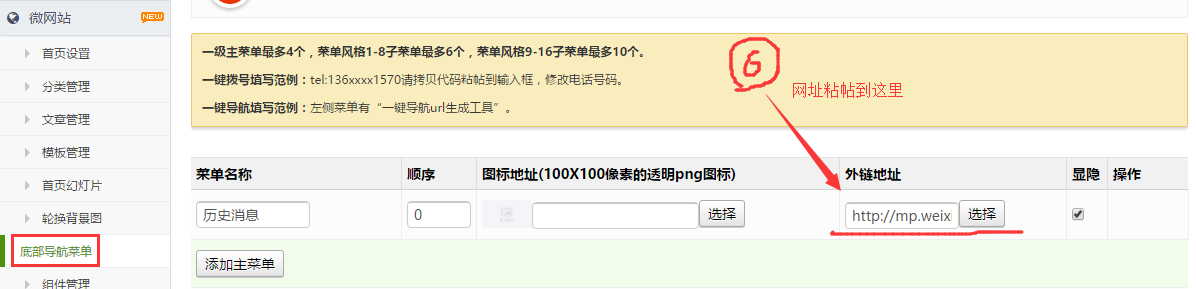 历史消息的网址可以放到微网站底部菜单里