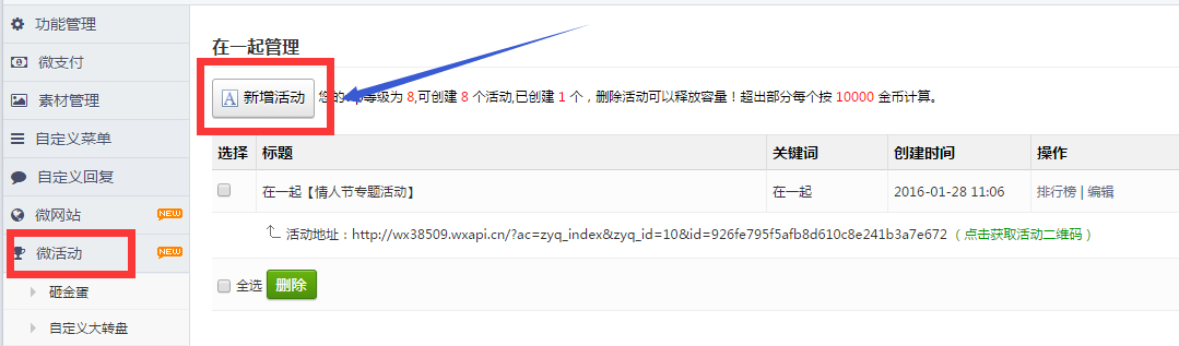 刷新页面,点击左侧功能管理栏——微活动——在一起