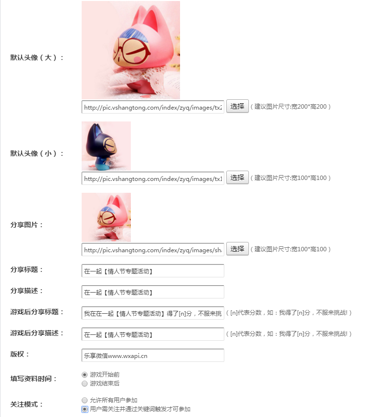 答案:因为你选择了"用户(粉丝)需关注并发送关键词才能参与游戏的模式",这种情况下只能通过触发(发送) 关键词 参与活动