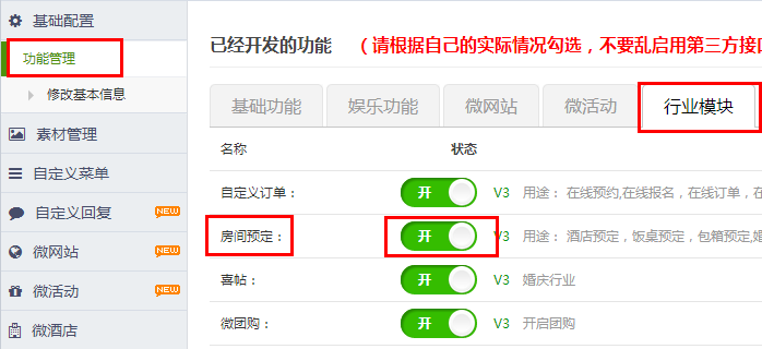 首先开启酒店功能,如图所示: