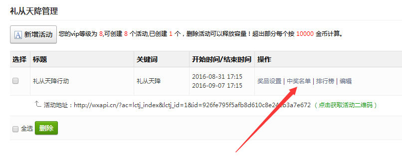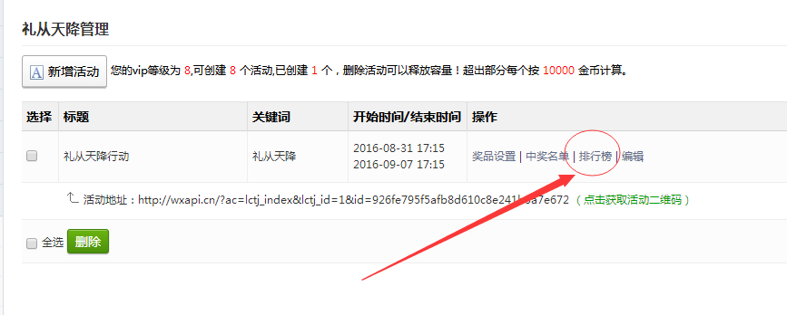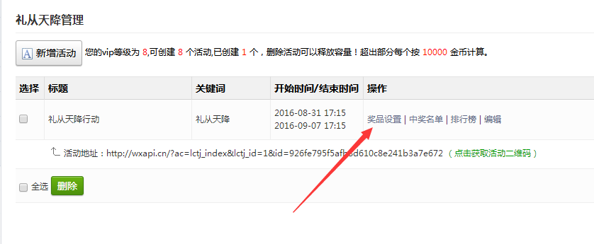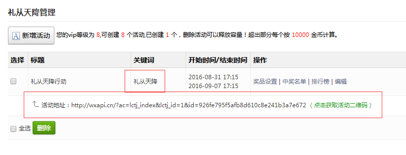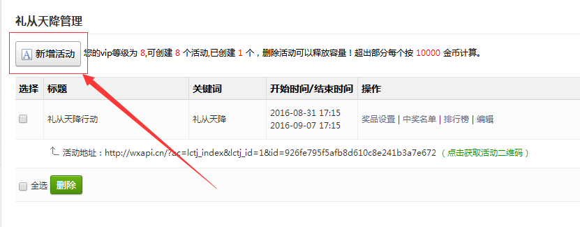 刷新页面,点击左侧功能管理栏——微活动——礼从天降