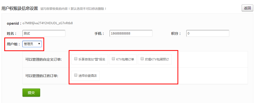 3.更改用户组为管理员,并且勾选订单及酒店: