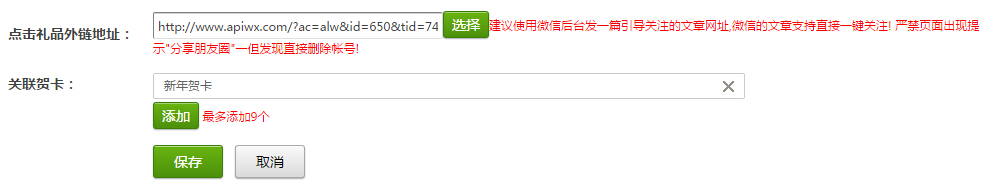点击礼品外链地址:建议使用微信后台发一篇引导关注的文章网址,微信的文章支持直接一键关注! 严禁页面出现提示"分享朋友圈"一但发现直接删除帐号!