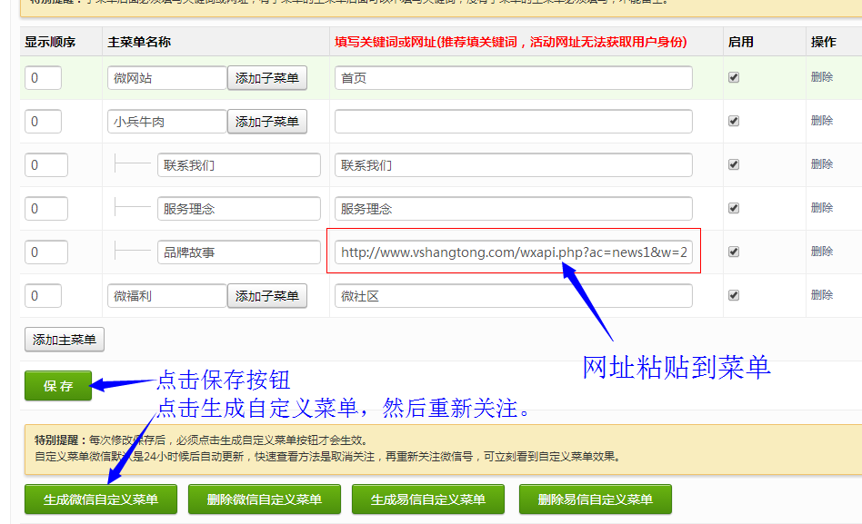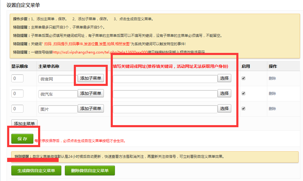 1、没有子菜单的主菜单后面关键词跟网址不能为空,不能存在空格,不能不填;否则自定义菜单按钮不能生成