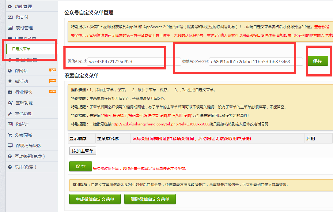 一、登录乐享后台,点击左侧“自定义菜单”,填写Appid和AppSecret,点“保存”按钮